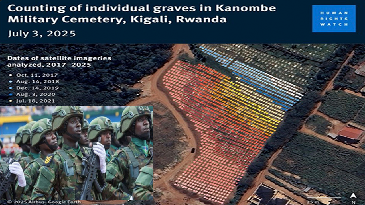 Human Rights Watch recently released satellite analysis of Kanombe Military Cemetery in Kigali, Rwanda. By examining 14 high-resolution images from 2017 to July 2025, HRW identified a sharp rise in freshly dug graves — with the steepest increase between 2022 and 2025. Each new burial plot was color-coded according to the date range in which it first appeared, revealing a striking visual record of mortality trends.
